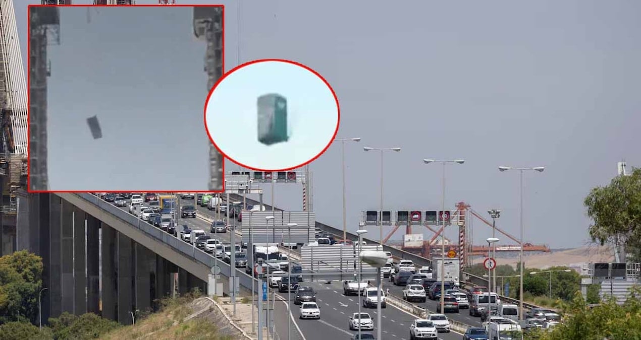 Olay, geçtiğimiz hafta Perşembe günü akşam saat 17:30 sularında meydana geldi. El País gazetesinin haberine göre, modernizasyon çalışmalarının devam ettiği ancak trafiğin aksamadığı Puente del Centenario asma köprüsünde, vinçle havaya kaldırılan taşınabilir bir tuvalet bilinmeyen bir nedenle bağlantı noktasından koptu.